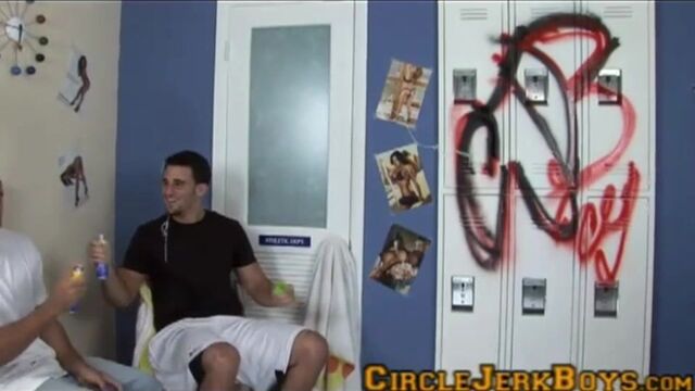This week we have a free for all in the studio. The Hialeah Hotties are back and this time we have Matéo Grande, Johnny Vino and Marcus Guitaro. For those of you unfamiliar with the 'Hialeah Hotties', they all, and by all we mean we lost count, went to high school together and have recently graduated. Hide your poodles and your daughters; cuz soon these man whores will be taking their gang bang tactics to college. If that's not a set up for a 'Boys gone-WHAT!?' feature length movie, we don't know what is! Infamous for their tall tales, Marcus starts telling us about his latest 'adventure'. He was up in Gainesville and loving all the white girls up there. He ended up at a club, where oddly enough 'Girls gone Wild' was at and they ended up grabbin' asses all night and his friend ended up fingering some of the entertainment-SECURITY! Johnny's story is a little different. By different, we mean plausible. (look it up) He recently went to a club with a bud and picked up some chicks. He got the back seat and started the party early with a blowjob and then that turned into a foursome when they did make it to his crib. Matéo, who prides himself on fucking 'whores', went to the Keys to chill with friends. While out boating, he came upon some girls on a raft. He splashed around with them then cock slapped them and gave them each a lap dance. Some girls have all the luck.Left to their own devices, these studs take spray paint to the lockers as they begin taggin' up. Taggin' turns into 2 on 1 as Marcus and Johnny cover Matéo in silly string. After that the boys are left excited and in need of something to wind them down. They clean off and as they do their clothes come off. They pop in porn and as they watch, they continue to strip until they are left in shorts then boxers. They each begin stroking their meat through the cotton containing them and each is popping a tent in no time. The boxers can only contain these 19yo boners for so long as each one of their baby makers finds its way out either through the fly or pulled out by the side. The camera gives us a view from below as these trouble makers tug on their 'disco sticks'. We're sure these sticks have made more than one lady gag(-gah) That's for damn sure! Johnny even made one chick walk home when she wouldn't suck his dick in the back seat. His Parents would be so proud. They lose their boxers and they each get comfortable as they continue stroking their swollen cocks. Matéo is in the middle of the room stroking the biggest meat on campus today.Matéo has the biggest dick but when we asked, the other two weren't that forthcoming with the fuckable facts. Matéo smugly grins and says 'Check out the site for the stats after the video and you'll see it'. Matéo just strokes his thick dick alongside and says his dick will be bigger in any unit of measurement Marcus wants to use. We wouldn't instigate Matéo. Matéo has perfected the art of busting his nut incredibly far and it wouldn't be the first time he's soaked a costar with his baby batter. All these studs are boned and rock hard as they slowly stroke their delicious dicks. They get on their knees and once they do, Marcus keeps insisting his dick is bigger. Big dick = bigger ego. Matéo Grande is 'Grande' for a reason and no matter how Marcus insists he knows he's the one packin'. Johnny is quietly stroking his cock and isn't even going to get into the 'biggest dick' race. Once they turn around to show us the rest, Johnny definitely has the best ass! The bigger is better madness culminates as they each shoot their breeder spooge all over a plate. Johnny unloads first coating the plate with his hefty batch. 'Last one to nut licks the plate!' he grins as the other two pick up the pace. Mateo covers the plate with his own huge load most of which flies past the intended target. Marcus shot last droppin' his nut on the cum covered plate. Fortunately for Marcus, he has dibs on that fresh protein shake!