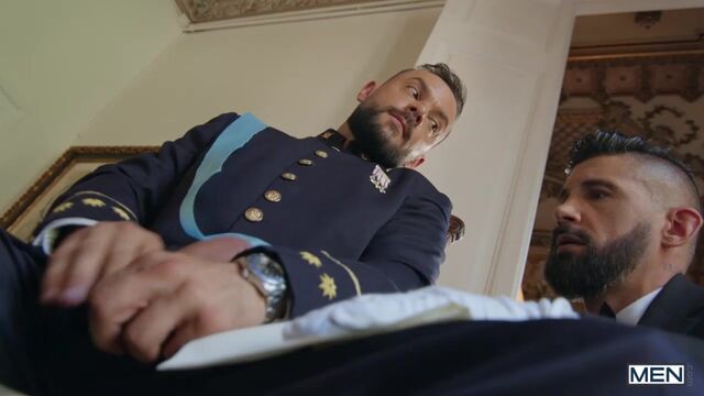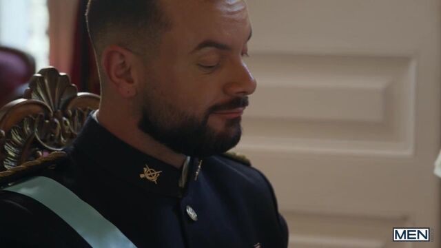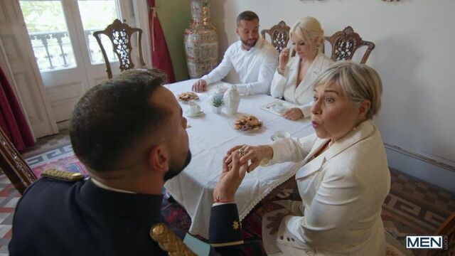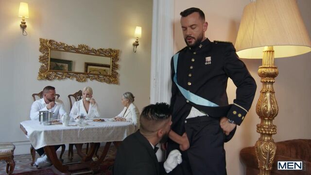 Loose cannon Euro prince Sir Peter is on thin ice with his mother, the queen, after yet another scandal hits the news. But that doesn't stop him from hitting on palace waiter Justin Jett right under her nose! After Justin spills some tea on Sir Peter's lap when he's taken by surprise by the prince grabbing his ass, the horny royal puts Justin's hand right on his cock, then takes it out under the table. The servant sucks the royal appendage just outside the door, then Justin gives Sir Peter a foot job. The horny prince rims and fingers the bottom's hole, then fucks him deep and hard. Justin rides His Majesty till he cums, and takes the royal load in his mouth. But the Queen is going to punish his royally slutty behavior once and for all!