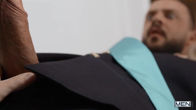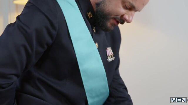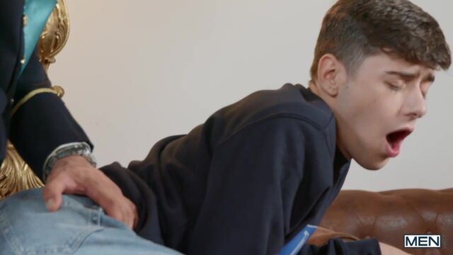 A prince's life isn't all play and no work; for example, today Prince Sir Peter is giving a lecture to a tour group of Men University students. But when the prince lays eyes on hot twink Joey Mills, he can't concentrate on describing the antique palace furnishings... especially after Joey crawls behind the podium and starts sucking his cock! Joey loves how expensive that dick tastes, and once the rest of the tour group leads, the handsome prince rips open the commoner's jeans and shows him what it means to be royally fucked. Sir Peter pounds the bottom doggystyle and fucks his mouth, even lifting him up for an upside-down blowjob. Joey rides His Majesty's cock until he cums and takes a Royal Facial. Has the Playboy Prince finally found his perfect partner?