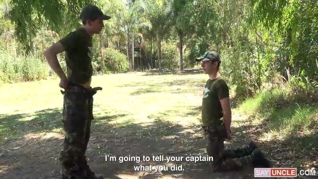 - Description: Every once in a while, young privates are caught wandering around. That’s the case of Loick, who is seen playing in the woods by his superior Jake during his patrol shift. Now Loick is in trouble, and Jake is eager to haze him. Yet, Loick is begging for it as he observes his superior’s cock while peeing, so Jake takes him to the barrack to teach him a lesson. Inside, Loick swallows Jake’s cock and gets the ass-pounding of his life.