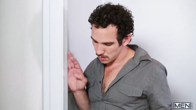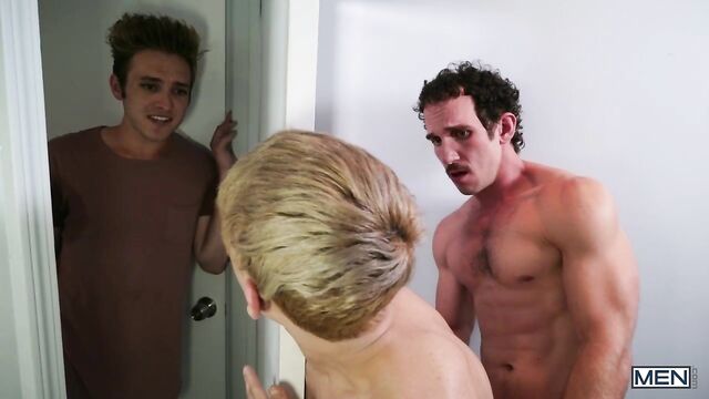 When Greg McKeon realizes his stepson Bar's hot friend Daniel Hausser is naked in the shower, he sneaks into the bathroom to watch the blond twink and jack off. Daniel thinks his bf's stepdad is super hot, and he's been waiting to suck his big dick! Ignoring Bar's calls that the pizza is getting cold, Greg fucks Daniel in the shower in a stand-and-carry and Daniel rides that cock. They manage not to get caught when Bar comes to check on Daniel, and he even kisses his boyfriend as his boyfriend's stepdad keeps railing him doggystyle! But when Daniel sits down at the table with Greg's cum all over his face, the jig is up.