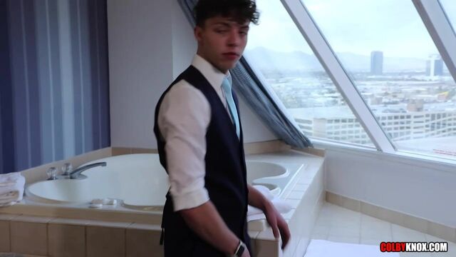 - Description: Today's ColbyKnox video has a special storyline. Colby Chambers is in his hotel, at the GayVN Awards, having some "alone time." He’s interrupted by a knock on the door. Colby covers up. Jack Valor plays a helpful hotel employee, delivering towels. Colby is intrigued by the vest wearing cutie. "Have you had any luck in Vegas yet," “bellhop” Jack wonders. Colby takes the clue by removing his towel, stroking his massive tool. "I was hoping to get lucky this morning," he replies. Jack turns around. His pretty eyes are a little shocked, and impressed by what he sees. "Are you into it," Colby asks. "I'm definitely into it,” Jack answers. He strolls over, grabbing Colby's cock. The two kiss. "I saw you when I checked in," Colby confesses. "And I have ordered towels for the last four days, straight, hoping you would make it up here." Persistence wins out! Always! :-) "I wish I had came sooner,” Jack says, before moving in for another smooch. He pulls away to swallow Colby's shaft. He grabs the back of Jack's head. "Did you come here to service me," Colby wonders. "Pick up that phone and dial you up whenever I'm horny?" Jack's replies are muffled grunts. "Suck my cock, you fucking little towel boy," Colby demands. Jack tries to swallow everything Colby has. "Let me feel those throat muscles," Colby says. When Jack comes up for air, threads of spit hang from his mouth. His eyes water from all the effort. Colby pulls him up; Jack turns around, leaning on the bed. Colby knows what he wants. He pulls Jack's pants down, exposing Jack's plump rump. Colby's tongue dives between the ass cheeks. "Whose hole is that," Colby wonders. "Is it my hole?" “It's your hole," Jack says. "Fuck, please. It's so good." Colby fingers Jack. "You are so fucking tight, boy," Colby observes. He stands up, teasing Jack's butt portal with his bloated head. "Please fuck me," Jack begs. "I want it so bad. Give it to me. Please." Colby works his raw dick inside. "Look at those butt cheeks quiver," he observes. He's slow at first, letting Jack get used to his hefty johnson. "You're my fuck boy for the day," Colby asks. "I want to be your fuck boy," Jack whimpers. His back is arched. Each stroke fills him to the rim. "Use my hole," Jack moans. That is exactly what Colby does. After slapping one of Jack's cheeks, Colby makes a demand. "Come ride it," he says. He sits on a chair, stroking his tool. Jack loses his pants and walks over. "Sit your fucking ass down," Colby whispers. He guides the tip back inside his towel boy. "Bounce on that dick," Colby commands. Like a pogo stick, Jack goes up and down. "You feel so fucking good," Jack sobs. "Service that dick," Colby replies. He grabs both cheeks, smacking them. "I want it so deep," Jack murmurs. "You want my cum in you," Colby wonders. "Yes, sir," Jack replies. "Go lay on the bed," Colby says. Jack doesn't need to be told twice. He slowly pulls himself off Colby's shaft. Next, Jack is naked, on the bed. His legs spread. Colby saddles up for one last round. "You fucking spread wide," Colby notes. “Like a fucking gymnast." "Use my hole," Jack begs. Colby does, making each stroke open Jack up more than he already is. "Fuck you're so deep," Jack moans. The pounding turns faster and harder. "Take my cock," Colby orders, making Jack's knees touch the mattress. "Use my hole, sir," Jack pleads. He pounds his meat as Colby pounds his hole. "Give it to me," Jack whispers. His legs shake as his hole is wrecked. All that fucking makes him bust a messy load all over his muscled stomach. It's Colby's turn to bust next. He’s gentle with the deep dicking but that man hole proves irresistible. He picks up the pace. He creampies Jack, flooding his guts with cum. When he pulls out man milk covers Jack's ass opening. Colby reenters, making sure his juice remains inside Jack for the rest of his shift. "It's been a pretty lucky trip,” Colby says, taking us back to the question that started this fuck-fest. "I say so," Jack smiles. "Let me know if you run out of towels again." Any bets on how many towels