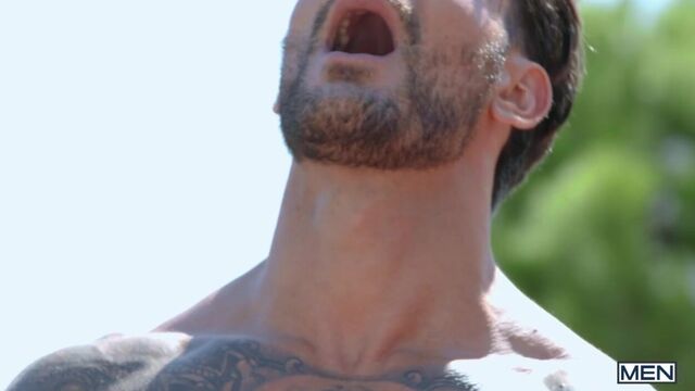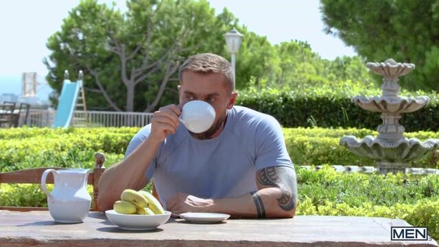 Tyler Berg locks eyes with Papi Kocic as he sits outside with his coffee watching the shirtless, tattooed top wield his hose. Papi wades across the pool to say good morning, and the bottom greets him with a hungry kiss. Tyler worships Papi's body and sucks his cock, then Papi tongues Tyler's hole and fucks him doggystyle on the table. Tyler loves Papi's dirty talk as he gets drilled in missionary, then rides the top's big cock. Tyler asks for it harder as Papi pounds him till he cums, and gets on his knees for a facial.