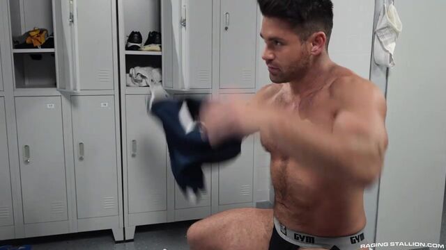 As naked rugby player Tarzan Top struts around the locker room, teammate Beau Butler can't help but admire his impressive cock. The two make eyes at each other and soon enough, Beau is on all fours with Tarzan's face deep in his sweaty cheeks. Tarzan uses his tongue and fingers to tease the burly jock's hairy hole before taking his thick dick to stretch Beau's asshole to its absolute limit. Barely able to handle the oversized pole that's dominating his thick ass, Beau clings to Tarzan as the hung top lefts his entire body in the air while still filling his horny hole. Now laying on the locker room bench with his cock spilling out of his jock, Beau shoots out a thick wad of cum moments before Tarzan's third leg breeds his hole and leaves his ass with a leaking stream of seed.