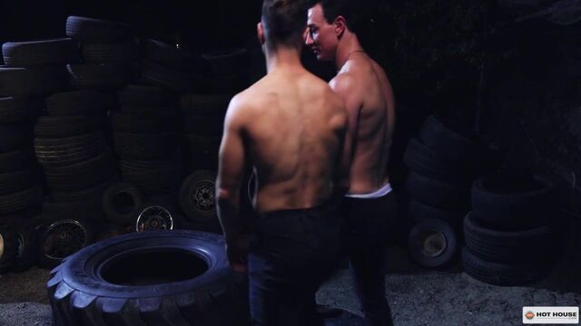 When you want to nut in the dead of night and can't host, everyone -- including Cade Maddox and Jackson Bell -- knows that the old junkyard is the perfect cruising spot. Surrounded by a fortress of worn tires, Cade yanks Jackson's thong to the side to better access his hole. He spits into and rims the horny stranger before shoving his oversized cock into his ass while Jackson kneels onto a massive tire. With the moonlight covering his naked skin, Cade slams himself into a grateful Jackson and only pulls out to pump Jackson's mouth with his massive cock and give him a taste of his own hole. Now on his back and struggling to handle the enormous slab of meat that's stretching out his ass, Jackson's cock pours out a massive load with Cade nutting all over the bottom's exposed taint.