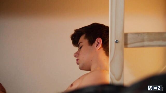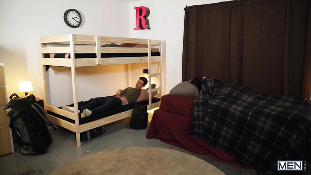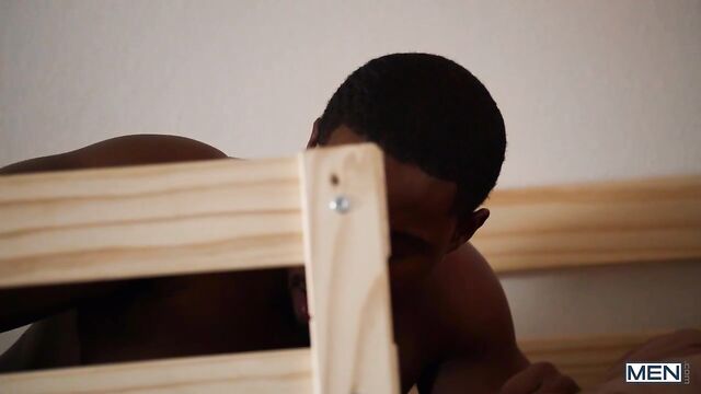 Joey Mills's girlfriend was sure she booked a private room at the hostel, but when they get there they find they're sharing with tall, ebony hunk DeAngelo Jackson, a top who always claims the top bunk. When they get back from the club, Joey is horny but his girlfriend wants to go straight to bed, so he gets in the bottom bunk and jacks off. DeAngelo lets his big cock fall through a hole in the mattress, and Joey swallows that big, black dick before the sexy top joins him to suck his cock and fuck him hard. The cute bottom rides DeAngelo till he cums, then takes a huge facial.
