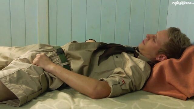 So what would you do if you accidentally stumbled upon the sight of dark-haired beauty, Sergey Vorobev, stripping out of his uniform and into the shower? Let’s be honest here, chances are you’d be just like young blondie, Jimmy Snyder, who finds himself quite simply entranced by the vision and who then goes back to his lodge to give his shaved cock a real hard work-out in appreciation. Sadly for him, voyeurism is more definitely the order of the day at this weekend retreat, and before he knows it he’s got Vorobev returning the favour through the bedroom window, together with the ever-sexually-charged sex-god that is Julien Heath. A few moments on and all three boys are inside the bedroom with their shorts around their ankles, slurping on each other’s meaty cocks and generally acting the part of complete whores. Indeed, it doesn’t take very much persuading for Vorobev to have his dick firmly planted inside Snyder’s ass – the young blond’s legs stretched apart to the max in the process. Then it’s Heath’s turn to get his ass pounded; before Vorobev and Snyder blast the contents of their tight balls into Heath’s mouth! In short, a must-see cum-soaked threeway!