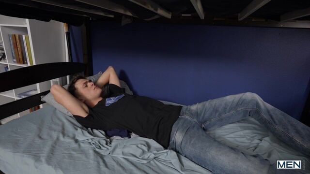 Men U frat bro Finn Harding is so horny he'll fuck anything, so when his roommate's boyfriend, Troye Dean, rims him in a case of mistaken identity, Finn's into it. After Troye's BF Trey says he's going to take a rest, it's time for these horny frat bros to get it on! Finn sticks his huge cock through a hole in the mattress for Troye to suck, then fucks the bottom doggystyle. They try to keep quiet as Troye rides him on the floor, but can't restrain their moans as Finn fucks Troye missionary, then on all fours! Finn cums on the bottom's face and Troye jacks himself off.