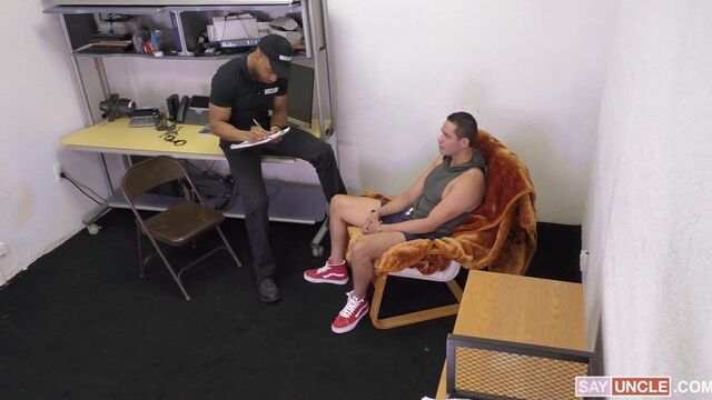 Officer Donovan takes Nico to the security office. The perp is handcuffed for stealing, but he believes his famous lawyer will get him out of this situation. Little he knows that Donovan won’t let him go that easy and that he shouldn’t be that cocky. To teach him a lesson, Donovan shows him his gigantic cock and feeds it to him. Nico complains but also savors the officer’s dick. As Donovan undresses, he pounds Nico’s ass nice and hard, teaching him not to mess with a security guard.