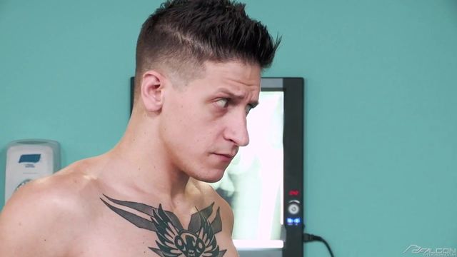 Dalton Riley makes a visit to the clinic as a precautionary checkup for testicular cancer. Since Dalton doesn't really know how to check for himself, he needs Dr. Ryan Rose's assistance. Dalton stands up and Ryan lifts his patients gown to begin the exam. When hot doctor Ryan is examining Dalton's balls, Dalton can't help but to pop a throbbing boner. Seeing how excited Dalton has become, Ryan drops to his knees and gets to work servicing his patient's massive cock. When Ryan has had his fill of cock down his throat, he turns Dalton around and aggressively eats out his ass. Dalton puts one leg up on the exam table to give the Doc full access to his smooth hole. Dr. Rose takes turns probing Dalton's ass with his tongue and fingers before gradually sliding his raw, big dick deep into Dalton's hole. After taking it bareback and doggy-style for a while, Dalton gets on his knees to taste the dick that was just buried inside of him. When Ryan wants back inside of Dalton's ass, he drills his cock deep until he can't hold back and longer and covers Dalton's hole with his thick load. When Dalton' looks down and sees his balls covered in Ryan's cum he lets off his own wad, shooting onto his rock-hard abs.