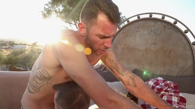 When the morning sun gets too hot for doing chores, Logan Cross and Brian Adams find the perfect opportunity to head up to the private rooftop patio and sprawl out on a daybed under a bright blue sky. Making out with a passionate intensity, the two horny studs slowly make their way out of their clothes, as Brian takes the upper hand and dominates Logan with a confident swagger. Hung stud Brian whips out his thick and lengthy cock for a hungry Logan, who takes his time with the impressive tool savoring a long, relaxed blowjob and nurses a humongous load out of Brian's swollen low hangers before blowing his creamy jizz in the afterglow of a sex-filled siesta.