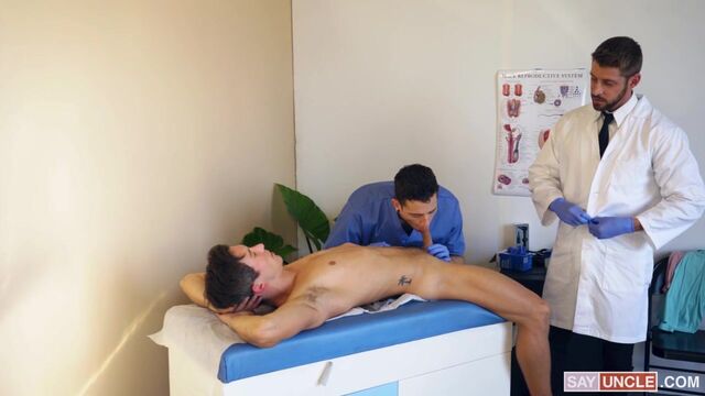 Isaac goes to Dr. Ford’s office due to a rather weird condition. He cannot take off his underwear because they are too tight. The doctor and his assistant, Quin, quickly suspect his dick has something to do with it. As they cut off Isaac’s underwear, his cock pops up, and the medical professionals realize a more thorough test is needed. Quin sucks the patient’s dick to check for his reflexes, and Dr. Ford feeds Isaac with cock to see if he responds to stimulation. The two won’t stop until they find a proper diagnosis for Isaac’s condition!