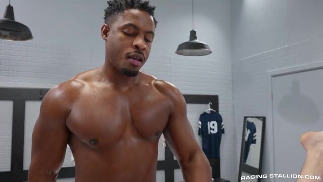 A casual game of grab ass in the locker room shower gets bumped to the next level with rugby hunk DeAngelo Jackson finds himself rock hard with teammate Michael Boston. In the shower's thick steam, DeAngelo kneels down to eat out Michael's wet hole before having Michael drop to swallow his throbbing cock. Some team bonding 69 action quickly leads to DeAngelo mounting his teammate and diving into his bubble butt with his raw cock. An overwhelmed Michael moans at every bareback thrust from DeAngelo as the hot jock furiously drills him in the middle of their team locker room. A few more pumps of DeAngelo's pulsing cock has Michael jizzing all over his patch of pubes with the jock top pulling out to bust ropes on Michael's smooth taint moments later.