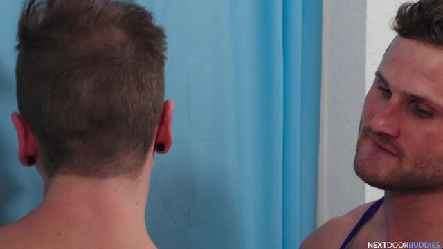 After working out, Devin Franco follows Blain O'Connor to watch him shower. He makes a makeshift glory hole in the shower curtain and invites Aiden Langston to join the glory hole fun.