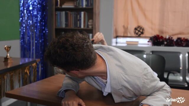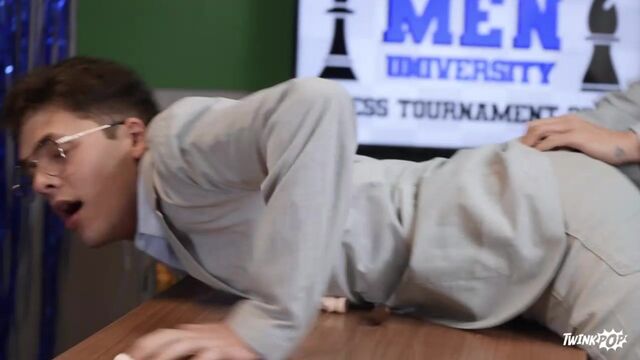 Instead of studying chess openings, Troye Dean preps for the MEN U chess tournament by sliding a vibrating plug in his opening so his friend can help him cheat. He's a little sweaty and suspicious when he sits down across from his opponent, Luke Connors... but that's nothing compared to when his plot is uncovered as Luke pulls down his pants and finds the toy! Luke agrees to a rematch, but first it's time to mate Troye. The bottom sucks Luke's cock, and the top rims and sucks him before the cheater rides his dick. Luke fucks Troye doggystyle against the wall, then cums on the twink before Troye jacks himself off.