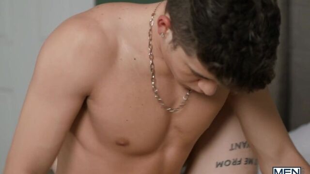 Roommates Drake Von and Noah Way have been trying not to act on their mutual attraction, but after they kiss at a club, Noah waits for Drake to get in the shower, then steals and sniffs his sweaty shirt while he fingers his hole. Drake catches the tguy masturbating and watches, then kicks Noah out of his room so he can jack off. But Noah peeks in at him, and soon these roommates are giving in to temptation. Noah sucks Drake as the top fingers him, then rides his dick. Drake fucks the trans cutie in spoon and doggystyle, and the twink sniffs Drake's shirt some more as he gets fucked in missionary till he cums. Then Drake pulls out and blows his load on Noah's tdick.