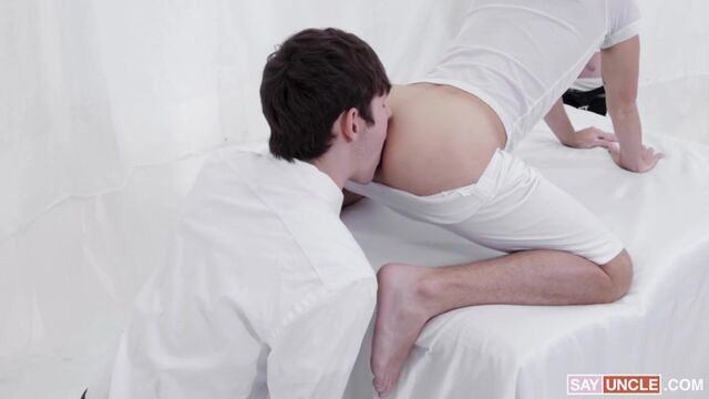 After Dakota reports Sam for wrongdoings, leader Brody must take immediate action. Sam is blindfolded and laid on a table, where Dakota and Brody will spank his ass and have their way with his hole. Sam loves the sensation and is happy to repent and pay his penance for his sins.