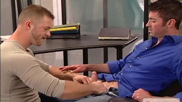 Paul Wagner and Berke Banks take a break from packing up their office to revisit some memorable after-hours experiences they have shared in the past. Wagner kneels down and opens his buddy's pants to reveal a rock-hard footlong which he sucks to the base. Banks returns the favor on Wagner's fat cock - sucking it like it may be the last time. Wagner's hole needs attention so he knocks a box off a nearby table and sprawls out spread eagle so Banks can pound his ass. The two moving men fuck all over the empty office until they blow loads of hot cum!