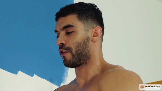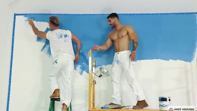 Arad Winwin and Ian Frost are up on the scaffolding painting an accent wall. When Arad accidentally splashes paint onto Ian's clothes, the painters quickly strip down and caress each other's sweaty, hard bodies. Ian is in awe of Arad's chiseled physique as he takes Arad's hard cock into his eager mouth. Arad grabs Ian's head and begins furiously face-fucking Ian's mouth. Ian tries to take as much as he can of the uncut member as he gags and drools all over Arad's thick, uncut dick. Arad reaches over and smacks Ian's tight little ass a few times as Ian's yelps are muffled by Arad's invading cock. Arad turns Ian around and lines up his manhood with Ian's quivering hole before pushing his raw cock in balls deep. Arad fucks Ian bareback on the scaffolding, pounding his tight hole with no mercy. Despite the moans and squeals coming out of Ian's mouth, Ian begs for more ass pounding. Arad is more than happy to oblige his willing hole's horny requests as he picks up the pace. Ian's cock throbs as he empties his load all over his stomach. As Ian's twitching hole grips Arad's unsheathed cock, he pulls out and shoots his cum to finish off the hot and sweaty fuck session.