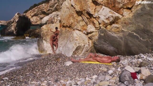There’s only so much training that a group of young life-savers can do to fill the hours between rescues – so how to fill the rest of the time that these boys have on their hands? Well, Nicolas Cruz and Mathew Ross have certainly come up with an idea, as they head to the beach to snog each other’s faces off against a backdrop of crashing waves and deep blue skies. Jon Roz, on the other hand, opts for a somewhat lazier alternative way to kill the time – lying in the sun to enjoy a gentle jerk-off. Not that he’s left on his own for very long, it must be said. Neither Cruz or Ross appear to have any intention of allowing the lad to remain there undisturbed, and before you know it the three have coupled up for a hot session of passionate cock-sucking. It all marks the start to a fantastic outdoor threesome that eventually sees Cruz ramming his cock up Ross’ ass; before Roz decides to take a cowboy-style ride on Ross’ rubber-free knob! Suffice it to say that it isn’t very long at all before all three lads are brimming towards ecstasy, with Roz taking a veritable face-load of cum courtesy of his two mates before pumping out the full contents of his balls over his own belly!