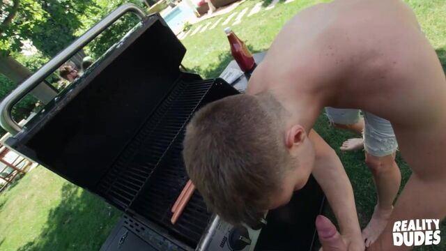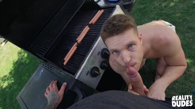 My wife's organized a nice barbecue, but my new stepson, Benjamin Blue, keeps flirting with me, even rubbing his foot on my dick under the table! When I drop my fork, Benjamin gets down and sucks my cock, then follows me to the grill to suck me hidden behind the barbecue. He puts my hard cock in a bun and drizzles it with mustard, then sucks it off before I drill him doggystyle. The jig is up when we get caught, so I lie down by the pool as Benjamin rides my dick, then fuck him missionary till he blows a huge load, and he licks up all my cum.
