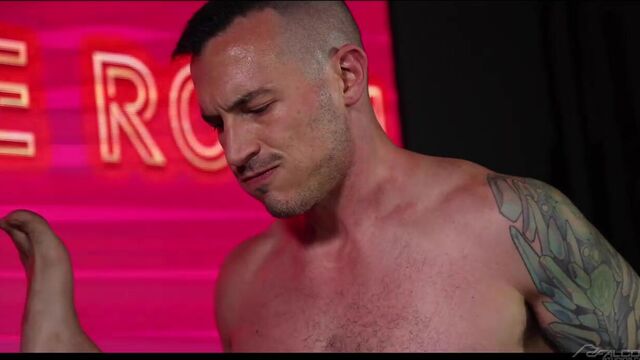When it comes to sex, Derek Kage just wants to be able to walk in a room, select his hole, and go to town, That's why the pure pleasure section of the 'Release Room' is perfect for his needs and why he's now letting Serg Shepard swallow his fat cock. Derek pumps himself into the willing stranger's mouth before rimming and 69ing with him. Once Serg loses his black jockstrap, he hops on his client's bareback dick and rides him while stroking his own meat. The hired hole then works his limber body into countless positions to satisfy his tattooed top until he's cumming on himself and Derek is blasting elongated ropes that cover his face.