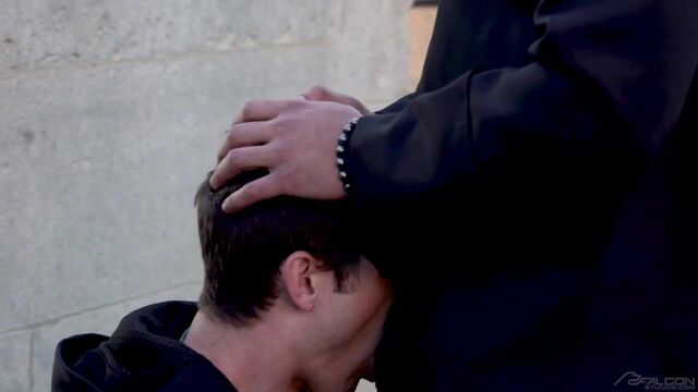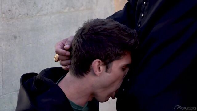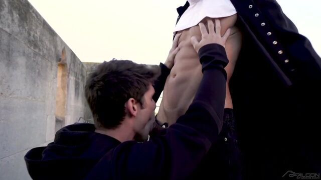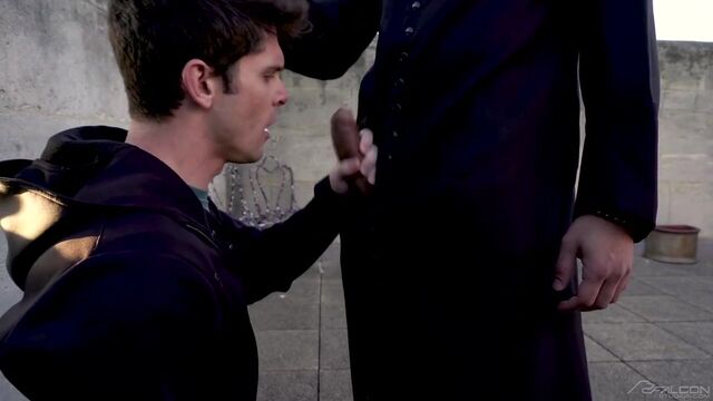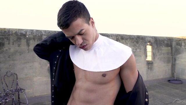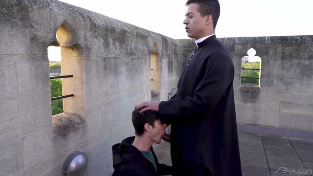 Devin Franco gets lost sightseeing in London when he meets the gaze of a friendly Priest named Jonathan Miranda. Devin nervously asks for directions and Jonathan leads him inside the church. Jonathan guides him up the old stone stairs to the roof where Devin bends over the ledge to check out the sights. Enticed by what he sees in front of him, Jonathan starts rubbing his growing cock through his black robes. Devin continues admiring the sights, oblivious to the Priest's subtle advances. Jonathan wants attention turned to him and whips out his hard cock to start jacking it out in the open. Devin finally notices the horny Priest and drops to his knees to profess his sins. Devin works Jonathan's holy pole in and out of his mouth until Jonathan leads them to another room where they can have some privacy and take it to the next level. Jonathan moves quickly and bends Devin over a table to slide his throbbing cock deep into the begging tourist. Jonathan's hips slowly grind at Devin's ass as Jonathan works his way deeper into Devin's hole doggie style. Jonathan keeps up the relentless pounding on Devin's tight ass until Devin flips the script and gets the priest on his knees to take some dick up his ass. Delivering a spiritual flip-flop moment, Devin drills Jonathan doggie. The Priest is in sexual heaven, but he isn't done with Devin yet. As any good priest would do, Jonathan, goes for missionary position, sliding his dick back in Devin's ass one last time until he pushes Devin over the edge. Devin let's out a gusher and Jonathan takes himself to the point of no return, pulling out and shooting his holy seed all over Devin's spent and panting body