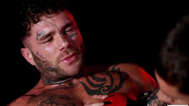 Joel Hart's muscles glisten with a deliciously salty layer of sweat as he delivers the final hit to his punching bag and instructs Vincent O'Reilly to suck the fat cock that's escaping his bright red jockstrap. Never one to pass up servicing a stranger's uncut pole, Vincent immediately drops down to have his mouth pumped with Joel's junk. The ripped athlete throws the cocksucker around until Vincent is clinging to the punching bag for support while he's being eaten out and barebacked by the boxing bro. With their moans filling the empty gym, Joel pounds Vincent from behind with his big dick before moving to a nearby bench so Vincent can ride him raw. Vincent, still wearing his workout gloves, strokes out a wet, explosive load all over himself and lies there in pleasure as Joel pulls out to bust on his meaty cock.
