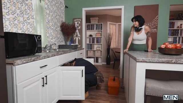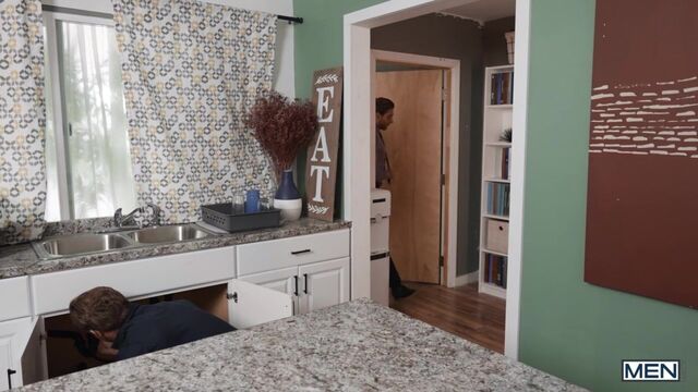 When Dom King finds hot, gay plumber Bruce Jones working on his pipes, he drops the info that he considered fucking dudes before he got married... and he's clearly still considering it! He gets hard picturing Bruce naked and bent over, and when the plumber asks for a hammer, Dom puts his tool in his hand instead. Bruce tells the married hunk to fuck him with the hammer handle, then Dom gets to give him a doggystyle fuck! Bruce shows the top how much better dudes give head, then Dom pounds his hole on the counter. The plumber rides him and Dom cums on his mouth.