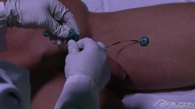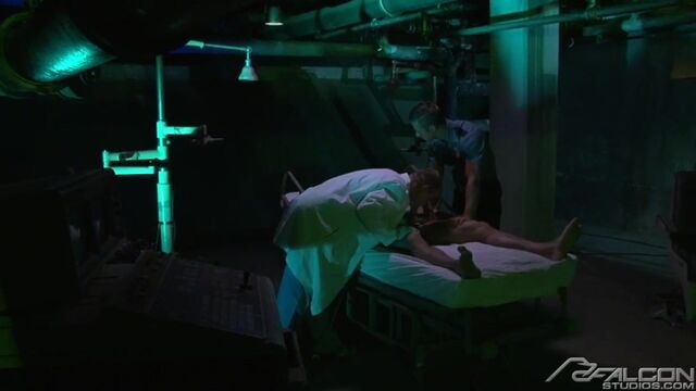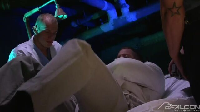 Erik hits the mother lode when he discovers the records room, its shelves pregnant with files of incriminating evidence. More interesting, he catches Ty Colt, one of the deviant doctors masturbating over some of the heinous documents. But it's lights out as Erik is knocked out. When he comes to, he's muzzled and bound in a straitjacket. He begins to freak out as the crazed scientist and his assistant, Rod Daily, subject their human guinea pig to experimentation. With probes attached all over his crotch, they shock Erik into blind submission. The therapy proves successful with the patient subdued, submissive and sporting a raging hard-on. Ty and Rod take advantage of their victim's vulnerability and subject him to a two-on-one intense sucking and fucking, plus a double punching of Erik's asshole with Rod's hard rod and a wicked nightstick. Finally reaching their breaking point, the three men climax one by one.Aftermath: Erik is left alone and vanquished. He was on track to destroy the madness, but instead became what he was seeking.