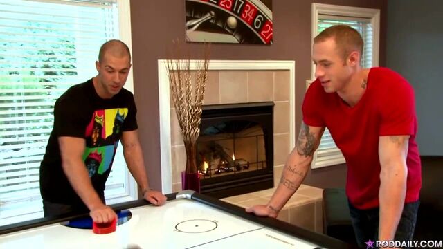 There's a pretty basic rule around Next Door Studios that Rod Daily knows all too well. Angelo Romani and Adam Pain are about to learn the constructs of consequences for playing seemingly idle games of leisure. For beware, around these parts the difference between winning and losing is the difference between giving and receiving... blow jobs that is. Adam is a little skeptical of the strict enforcement of this provision until he finds himself on the losing end of an air hockey bet and stiff end of Rod's dick. Although in all honesty, it appears as if Adam wasn't putting up too much defense in either case, so maybe he's just a little bashful about his cock lust. Either way, he gets what is cumming to him, as both Rod and Angelo take turns fucking his holes from both sides, before they all three shower Adam with the residuals of his hard earned defeat.Enjoy!