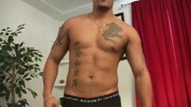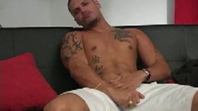 I am sexual - anything comes along that I like, I'll do it' is how 25 year old Joe Strong introduced himself, and that is just the kind of introduction we like here at ExtraBigDicks.com. We are pretty sure he was not given the name Joe in his native Puerto Rico, and as for 'Strong,' well, strength is what he needs to haul around a slab of meat this big - and strength is what you are going to need when you see it. An early bloomer in all respects, Joe starting jacking at ten, fucking at twelve and has lived out the orgy, 3-way and 'Mile High Club' experience most guys twice his age are still hoping for. As for the age of question of 'do big dicks run in families,' Joe was also able to corroborate what we already know from Cooker, that the answer is 'Yes.' Having caught his brother rubbing off a load, Joe knows he is not the only giant cock at their family reunions. While his brother was embarrassed when Joe caught him red handed, when Joe was caught, he liked it...and if he likes being watched as he plays with the big dick, he sure came to the right place.Joe's black wifebeater shows off his well-inked bicep as he reaches inside to tug on his nip, leaving the shirt pulled up to just under his pecs, showing off another line of ink, this one disappearing into the waistband of his shorts. Joe grabs tightly at the big bulge in the center before flexing his big arms as he lets his shorts drop to the floor. His hand goes immediately to his briefs, and he tries to rearrange the hardening cock inside, but that big dick had other ideas. It immediately reacted to the warm touch of his hand by doubling in length, so what else could Joe do other than what we have been waiting for all along, haul out that fat, uncut slab of dick and give it the quality time something this hard, thick and wet deserves.Licking his fingertip and bringing it to his cock head to mix his spit with his precum, Joe delicately touches that belly of the beast before roughly swinging that meat back and forth, side to side, and up and down before moving to the couch and humping away like a man getting his chance at fucking before being shipped off to a deserted island. Harnessing the strength of those rounded, white buns of granite, his biceps tense as he holds his upper body up off the mattress. We were almost in awe as Joe maintained total control over every inch of his body to pound away like a machine designed for the singular purpose of reproduction. His cock gets fattest half way down the shaft, and we just imagine the stretching it does to whatever hole is lucky enough to be invaded by it. With the cock ring looking more like a tourniquet as his shaft and sack battle to remain under control, Joe relaxes his neck, tightens his grip, and spills out a thick white load that drips down all over his abs and puddles on the floor below. If you do not have the strength you need to make it through the holidays, at least you have Joe Strong!