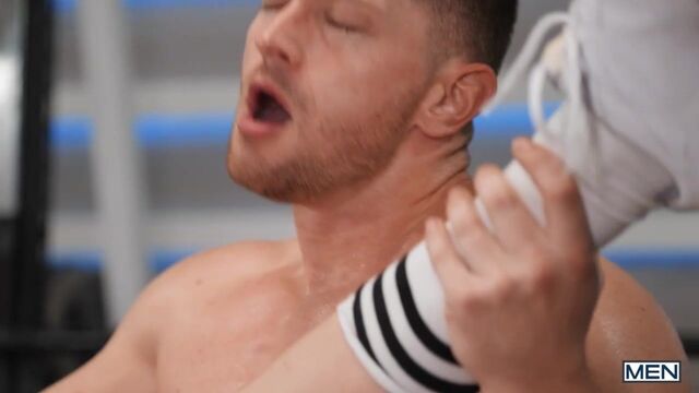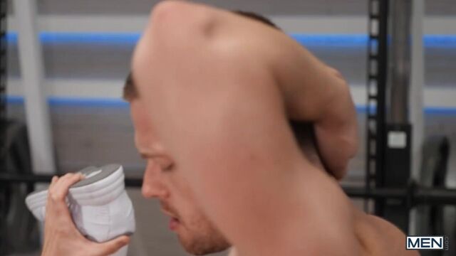 Twink Troye Dean is hitting the gym when muscular hunk Johnny Donovan walks in and renders him speechless. He can't tear his eyes away from Johnny's fit body and tries to follow along with Johnny's workout routine... with much smaller weights, of course. The twink's firm ass attracts Johnny's attention, and when Troye is trying to bench press, Johnny sits on his face, then fucks his throat! The guys suck each other and Johnny rims the bottom, then fucks him doggystyle. After Troye rides him, Johnny bench presses the twink, then fucks him till they both cum.