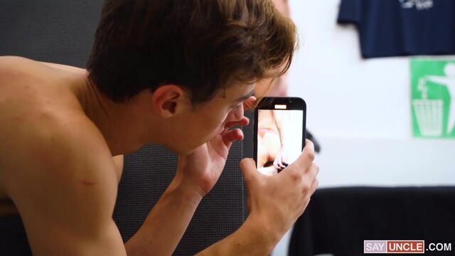 Nick is changing in the locker room when he overhears Jordan, his hot bully, coming in. Nick hides to avoid Jordan, but he can’t help but notice his huge bulge, so he decides to take some vids and pics with his phone. But Jordan discovers him and decides to give him something he’ll never forget: a nasty plow.