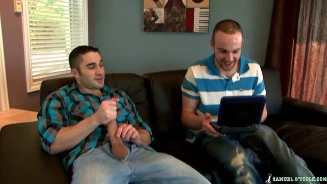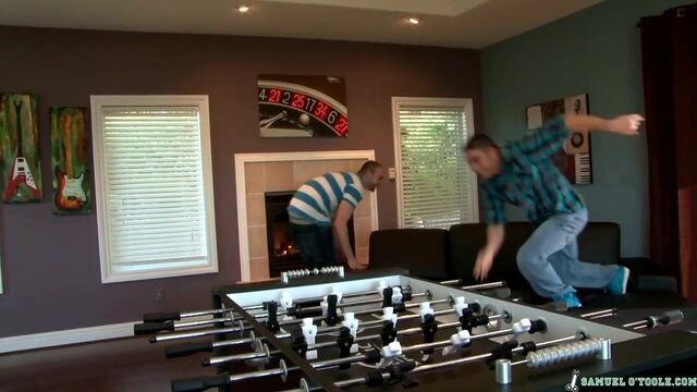 Chris Smooth is a very competitive guy. Samuel O'Toole has known that for a long time. The two have grown up together, always looking for the next opportunity to challenge the other. And Chris knows Sammy is a poor loser. He always quits or goofs off when he's not winning, a very frustrating thing for Chris. When Sammy loses in a game of foosball, he decides to run off, but Chris isn't letting him get away easy this time. After hiding in the bathroom for a few minutes while Chris pouts on the couch, Sammy emerges with a new idea for a fun activity. When Chris sees the size of the boner Sammy's been working on in there, he figures he might as well pull his cock out too. Chris has some porn he decides to play for them both to enjoy and cool down from the intensity of the game. Sammy and Chris are learning that even though they have a friendship of fierce rivalry and a spirit of competition, they're still good buddies. Watch them stroke their meaty cocks together, enjoying each other's cumpany. Enjoy!