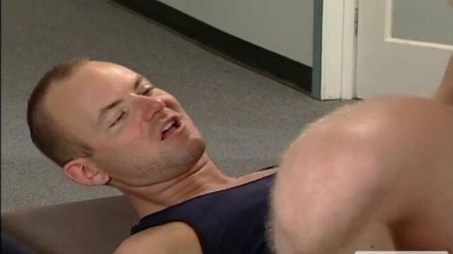 Muscle-pup J.R. Matthews thinks he's alone so he strips down and jacks off. When his roommate Robbie Ireland walks in on him he doesn't stop - and Robbie doesn't want him to. The site of J.R.'s smooth white skin and big cock gets Robbie all worked up so he pulls out his own fat long tool and feeds his horny friend his cock and balls. Robbie spends some time eating J.R.'s ass before laying back so Robbie can ride his cock. The two all-American hunks jack off and shoot huge loads all over J.R.s hot body.
