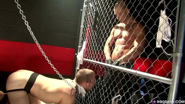 Some know of Rod Daily's darker side which tends to sometimes edge him toward sadistic behavior. He's managed to find a release in one Mr. Cody Allen. You see Cody is a glutton for punishment. He enjoys the feel of hard steel around his neck and stiff cock in his throat.But from the encounter depicted here, you'd never know his name is Cody. No, our Rod Daily simply refers to him as 'slut boy.' For Rod, this Cody is only good for a few things, that's why he's been chained to a fence and left alone in a dark, poorly lit room, with only an old mattress for comfort. When Rod comes in for Cody's Daily dose of dick, he finds Cody's been relaxing. 'Who told you you could relax?' Rod asks. 'Nobody,' Cody answers sheepishly. 'Then why are you relaxing?' From there, you can guess the type of repercussion Cody faces. Rod's jamming his thick erection into Cody's eager mouth through a stretched open hole in the fence. And for being such a filthy cock lover, Rod's whipping Cody's backside with a cat-o-nine tails. Then he's stuffing a pump-up dildo into Cody's tight ass to get him ready for a dungeon plowing from his master. You'll salivate when you see the way powerful Mr. Daily deals with his chained slut boy. Enjoy!