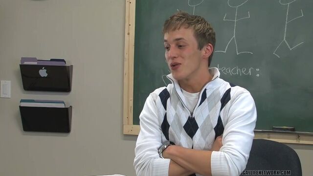 You can feel the sexual tension in this scene. Angry teacher Brice Carson has retained one of his student after class. Brice is accusing this cute looking twink, Kirk Taylor, of cheating during the test. Apparently, someone has passed him a note with the complete set of answers! They will quickly figure out a solution which involves cock sucking, rimming and hot sex!