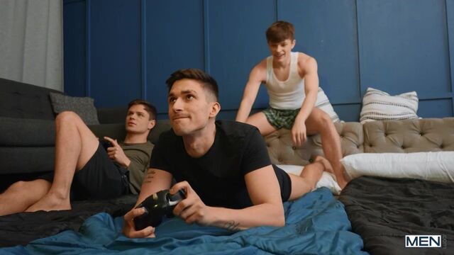As soon as he arrives at his friend's house for a slumber party, Jake Preston notices how hot Dylan's dad, Brogan, is! But Jake and his boyfriend, Kane Fox, are there to hang out with their buddy, not lust after the hot bearded daddy... or are they? Jake gets horny as Dylan and Kane play some Anal Cumbat and rubs the bottom's ass, then jacks off, and Kane sneakily sucks the top's dick until Brogan catches them! After lights out, the twinks try to be quiet as they fuck in spoon position on the living room floor. The guys suck each other, then Kane rides the top before getting pounded in doggystyle till he orgasms, then gets fucked missionary and covered in Jake's cum!