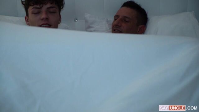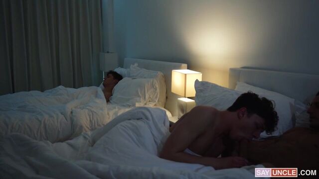 Jax, Andy, and Jack are staying at a hotel for the night, but there is only one room available, so the three will have to share. Jack is happy to do so, as he has always had the hots for Jax, his best friend Andy’s stepdad. Late at night, when the boys are asleep, Jax is horny and feels the urge to jerk off. Jack wakes up and jumps at the chance of tasting his cock. Suddenly, Andy is up as well, and he quickly discovers what the two are up to. Though he is initially pissed at his stepdad, Jax easily convinces Andy to join them in an intense threesome.
