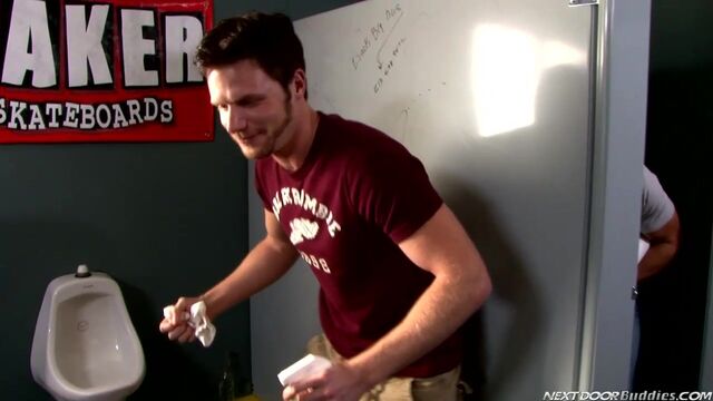 Brian Bonds and Brandon Lewis are trying to make the most of a pretty shitty situation. Sentenced to some light probation cleaning graffiti, they find themselves cleaning the graffiti at the local university locker room. Disgustingly filthy, marked up to hell, they set to the task of cleaning. Brandon discovers a glory hole in one of the stalls, and curiosity sets in, so he drops his pants and shoves his dick through the hole. To his surprise, Brian takes the cock in his hand, thinks about it for a minute, and decides he's got nothing better to do, so he puts it in his mouth and begins to suck. Of course, the novelty of the glory hole is fairly useless in this situation, so Brandon comes out of the stall and bends Brian over to fuck him up against a locker. First he eats Brandon's ass and gets it nice and moist before he slides his cock in from behind. Pushing him up against the locker, he starts to pound Brian until the lockers shake. Not wanting to make too much noise, they move to a bench where Brian rides Brandon's cock so hard his own dick explodes hot goo all over the place. Totally turned on, Brandon flips Brian over and spews his hot load all over Brian's stomach. Looks like they have something else to clean now.Enjoy!
