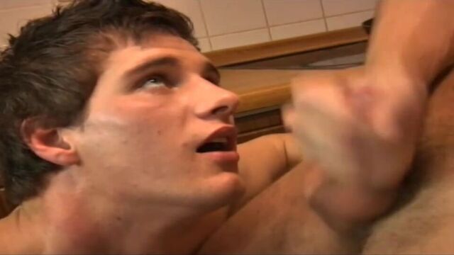 The graduation celebrations are well under way, but for some of the guys work has to come first – including Marco Bill and Tyler Morris, who for some strange reason appear to have left college to work at a bed and breakfast! Not that their new jobs entail anything other than engaging in a constant stream of sexual innuendo – the old “customer wants a sausage” routine – and hot, over-the-kitchen-table copulation. The latter of which these two handsome young studs are able to undertake with breathtaking gusto. Bill’s thick, uncut cock is working its way up Morris’s crack pretty much before you know what’s happened, ultimately resulting in a cascade of liquid protein from both parties. Cream is very much the order of the day in this kitchen, that’s for sure.