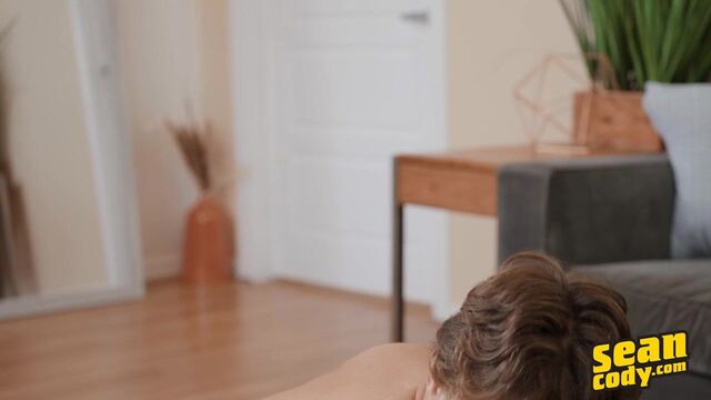 After kissing amid the trees and flowers and then doing situps and jumping jacks in the car, Oliver can't wait to get a taste of Kieran's cock and sucks him in the car! Back at the studio, the guys quickly undress and Oliver gets on his knees to show his deepthroating skills. "I want it so bad," Oliver begs, and Kieran assures the twink, "I'm gonna give it to you." Oliver sits on the top's cock, riding him on the couch till Kieran flips him onto his back and pounds his hole in an intense missionary fuck. Kieran takes the bottom from behind while kneeling on the floor, then bent over the table till Oliver cums on it. He licks up his jizz as Kieran shoots an impressive load on his ass and back!