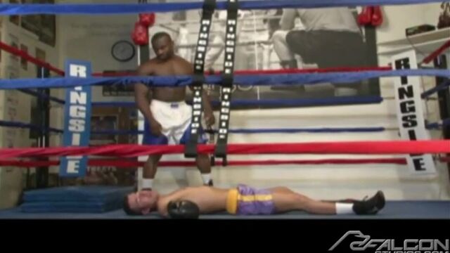Marc Williams delivers Dominik Rider the ultimate insult: he fights like a girl. Fighting words indeed and the two decide to settle it in the ring. The bell clangs and the pugilists dance around, trading blows and quick jabs. After a series of punches, Dominik is down for the count. He's out cold. Like any victorious warrior, Marc enjoys the spoils of war. He strips Dominik down to his jockstrap and starts to feast on his asshole. Dominik slowly recovers and happily submits for more, the tongue action sending him into orbit. He's still on the ropes as the brown bomber starts to fuck his hole. Marc is fucking him so hard, Dominik's seeing stars and he starts to jerk himself off until he cums in his hand. Then he sucks Marc's licorice stick until he gets a blast of jism in the face.