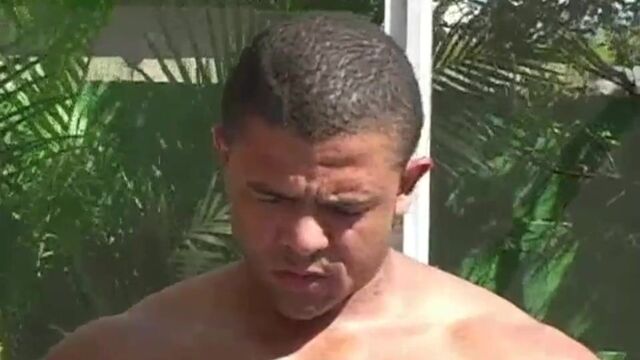 July 4th celebrates our independence from the motherland, but we are doing things a little differently here at MenOver30.com this year. We are utilizing international relations - namely, a trio of big-cocked, uber-muscled and ultra-handsome Brazilian beauties: Miguel, Diego and Magnus. To ensure you will get to observe the day by granting independence to a mother load of sperm, we are serving up a pool side spread of massive muscles and almost two feet of some of the thickest, hardest and juiciest dick steaks we have ever seen. When Miguel returned after a year honing his body to perfection a few weeks ago, it was not a surprise to learn that Diego's canvas of the masculine ideal had been undergoing some homo improvements of their own, since they are after all buddies from the gym. We also knew, from one of the steamiest afternoons ever in the studio, they sometimes have sweated together in the bedroom. The tallest and most hung of them all, Magnus, with nine uncut inches that never fail to inspire, also caused Miguel to perspire when Magnus and Miguel redefined what a post work out rub down is on our brother site, ExtraBigDicks.com. While individually and together, Miguel, Diego and Magnus have enjoyed themselves and each other, they have never been naked, hard and ready for action all together...until today!Their bathing suits clinging like second skin as they stand together in the sun, the rays gleam off the symmetrical perfection of Diego's body, stream down on Miguel's hair-covered masculine attributes, and finally shower down on Magnus' vascular tower of meaty flesh. Starting with a race to see who is king of the pool, as they leave the water to dry off after, it is clearly the hugely-hung Magnus who is King Dong as their bathing suits get smaller as their dicks get bigger. Seems when you are a Brazilian and packing the kind of oversized, thick meat like these guys are, you are immune to any shrinkage affecting most mere-mortal males. Magnus ascends onto the massage table like a king taking the throne and the only speed eclipsed by that of his trunks going down is the rate at which dicks goes right up into Miguel's thick lips. Miguel and Diego are used to sharing big heavy things, and Magnus' dick is no exception. Before long, that heavy tube steak does some dental excavation on Diego before the guys, and the action, move back to the pool.Miguel is rubbing Magnus' pecs as Diego's head bobs up and down on Magnus' cock while the heavy balls float on the water right behind. Standing up, Miguel resumes the sucking duties on Magnus as he squats on the deck of the pool, allowing him the room to stroke his own equally-hard cock and Diego beats his own meat watching Magnus and Miguel go at it. Magnus soon takes the voyeur slot as Miguel and Diego turn their attention back to each other in a rotating pool side sixty-nine. The triumvirate moves one final time behind the massage table and, like a well-practiced synchronized artillery salute, they fire off their big guns one by one until three huge white loads decorate the blue towel and three faces flushed red in erotic exhaustion cap off our celebration in a patriotic display of red, white, and blue worth celebrating.