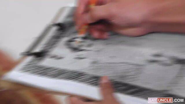 Gabe feels he can’t properly draw human figures for his upcoming test, so his stepdad Greg decides to help him out by modeling naked for him. Gabe does a great job at sketching him, but he can’t simply get his eyes out of his stepdad’s cock under the towel. When Greg notices, he’s so determined to give his stepson a hand that he takes off his towel and lets him suck his dick. The art session soon turns into a nasty plow to get Gabe’s creative juices flowing.