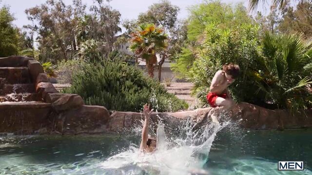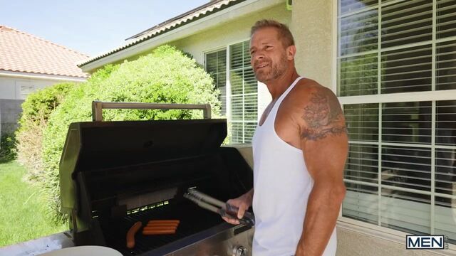 Twink couple Spikey Dee and Joey Mills are ready for a weekend of fun in the sun at the home of their favorite daddies! Spikey and Joey's making out in the pool soon turns to Joey sucking his BF's big cock, but they're interrupted by the other guys splashing. Spikey gives bearded hunk Greg Dixxon a hand with the wieners on the grill, and Greg sucks him, but leaves him with blue balls yet again, so the twink follows Greg into the kitchen and fucks his hole! Spikey sucks the bottom, then fucks him on the counter before bending him over it for more deep pounding. The bottom cums as he gets drilled in spoon position, and Spikey pulls out and finally shoots an enormous load.