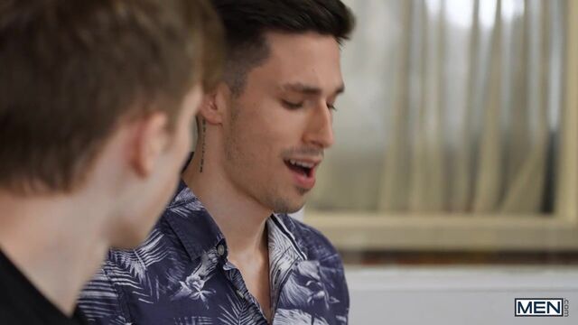 Jake Preston has hired a hot tutor, Kane Fox, and he's more interested in what's in Kane's pants than what's in his head. But as he strokes Kane's dick behind his bf's back, little does Jake realize that Caleb Manning also wants some of the sexy tutor. Caleb crawls under the table to worship Kane's feet, then entices him to the bedroom. Kane rims the bottom and is about to fuck him when Jake comes looking for him! Caleb's hole is ready, so Jake decides to fuck it, and Kane comes out of hiding to join the twink train. Kane fucks Caleb missionary while Jacob enjoys getting rimmed and sucked by the other two, and then it's time for Jake to top Kane before they cum.