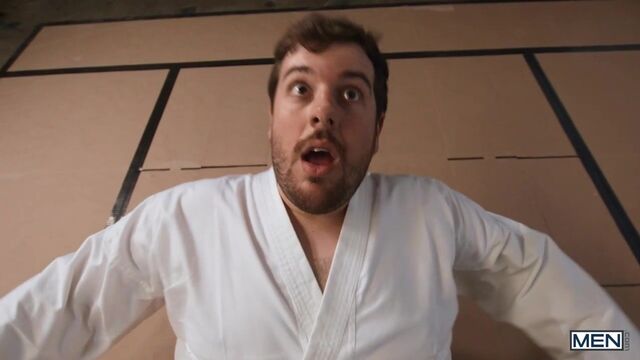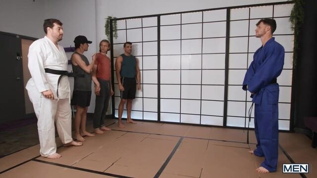Presley Scott and his buddies show up for their first martial arts class, and Presley's very impressed by hot sensei Finn Harding. Finn tells his class he wants hard strikes and sets them to spar, but not before demonstrating some moves on Presley that include grabbing his balls and rubbing the bottom's bulge with his leg! After Presley knocks out his sparring partner, the guys have some time alone to practice one-on-one, and take off their clothes before their tongues wrestle. Presley sucks the top while striking his ass, then gets on his hands and knees to get fucked. He rides the master, then Finn uses some advanced techniques to pound him on his back and make Presley blow a huge load before he strikes the bottom's face with his cum.