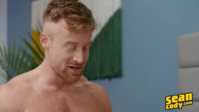 Tall, shaven-headed Evan joins new redhead hunk Tim in the studio, and before long he's sucking the top's cock, then riding Tim on camera for the first time. Evan's impressed with Tim's muscles, telling him "Oh fuck, you're so sexy" as he looks down at him while riding him. Evan takes Tim's breath away as the top fucks him doggystyle, and Tim gasps, "That's amazing!" Evan cums while Tim pounds him in missionary, then tells the newbie to jizz on his ass.